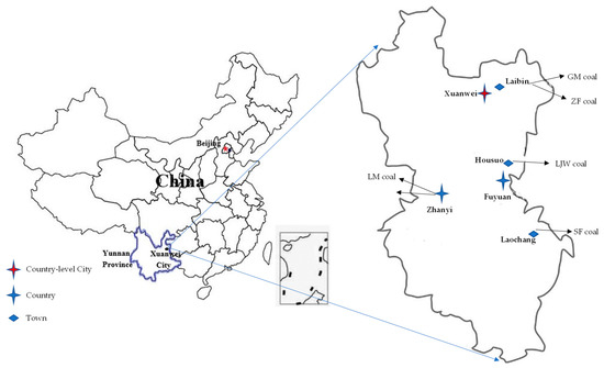 After field investigation, we collected raw coal from three areas, including six kinds of residential coal (Table 1) from Zhangyi District (Luomu coal (LM) and Bole coal (BL)), Fuyuan County (Houshou Town, Lijiawu coal (LJW); Laochang Town, Shunfa coal (SF)), and Laibin Town in Xuanwei City (Guangming coal (GM) and Zongfan coal (ZF)). The information about the sampling site is shown in Figure 2. All collected samples were stored in plastic bags at the sampling site to avoid contamination or oxidation of the samples. The residential coals were collected according to the methods [29].
