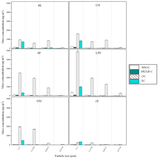 Figure 7 show the mass concentration (μg m−3) and standard deviation (STD) of OC, EC, WSOC, and HULIS-C (Coal, N = 6) in RCC particles. The mass concentrations of HULIS are in the following order: 1.1 μm > 1.1–2.0 μm > 2.0–3.3 μm > 3.3–7.0 μm. The mass concentration of HULIS-C in our research far exceeded HULIS-C in the ambient average range of 0.8–15.9 µg·m−3 [8,15,31,55,56,57]. The variability in mass concentration can be explained by the independent and closed sampling system. It is also related to the type and maturity of the coal. Relatively little water-soluble brown carbon was found in particles produced by burning middle-maturity coal in residential stoves, while significant amounts were found in low maturity bituminous coal and anthracite [58]. Unlike general atmospheric particulate sampling, we collected high concentrations of RCC particulate matter directly with our sampling system. In the future, a comprehensive investigation of coal combustion HULIS-C emissions under different stove types, combustion conditions, and combustion stages is necessary to better understand the distribution pattern of HULIS-C.