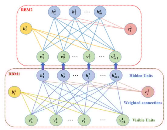 In the traditional DBN network, the RBM is a neural network with two layers of neurons, also known as the visible layer and the hidden layer. The visible layer consists of units that accept input data, whereas the hidden layer is separated from the input and contains units for feature extraction. The units within each layer are isolated from each other, but the units between the two layers are interconnected. A real number called the weight is associated with each interlayer connection. The structure of an RBM is illustrated in Figure 1.