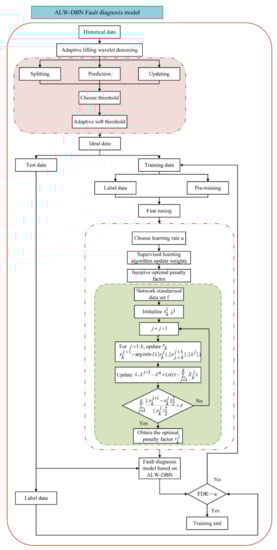 First, the process data were upgraded by an adaptive wavelet transform, and the adaptive soft threshold method was used to reduce the noise after the wavelet lifting splitting, prediction, and update stages. Then, the ideal data were divided into a training set and test set according to the ratio of 4:1. The unlabeled data samples in the training set were pretrained using a layer-by-layer unsupervised algorithm. Pretraining was divided into two stages. The first stage included 100 iterations of pretraining with a momentum parameter of 0.5 and then 200 iterations of pretraining with a momentum parameter of 0.9. In the pretraining stage, the number of updated data samples in each batch was subject to actual process data samples. The model consisted of five RBM layers. After each RBM was fully trained, the entire network model was fine-tuned. In the fine-tuning stage, the learning rate was determined, and then the weights were adjusted and updated by the wake-up sleep algorithm of supervised learning. At this time, local optimization may have occurred in the model, and hence, a penalty factor was added to optimize the penalty term of the model. We used penalty function for iterative optimization and iterated on the standardized network data completed by the pretraining to obtain the best penalty term for the training data set, correct the BPNN weights and reduce the accumulation of errors caused by multi-layer DBN training. After completion of the fine-tuning stage, the label data generated by the training set and the test set were input into the ALW-DBN diagnosis model. Finally, we determined whether the FDR reached the set standard If not, a return to the retraining step was necessary.