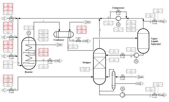 The TE process was widely cited as a benchmark for studies in control, optimization and fault diagnosis. The flowchart of the TE benchmark process is depicted in Figure 5 [44].