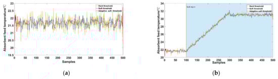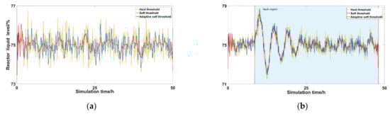 This study used three kinds of threshold methods to perform three sets of comparative experiments on the monitoring variables of the TE process. The monitoring variable in Figure 6a is the reactor liquid level, which corresponds to the data of the TE process that was continuously simulated for 50 h under normal conditions with a sampling interval of 3 min. The monitoring variable in Figure 6b is the reactor liquid level, which corresponds to the data after the TE process was simulated for 8 h under normal conditions and the fault 1 disturbance signal was added, and the simulation continued for 40 h. It can be observed from the figure that the data processed by the adaptive soft threshold method had fewer high-frequency disturbance signals than those processed by the soft and hard threshold methods, and the graph change trend was more stable.