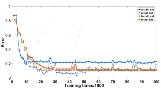 In Figure 7, the label a represents the sample size of each batch of updated data during the fine-tuning process without adding a penalty factor for 640 iterations. Label b represents the sample size of each batch of updated data after the penalty factor is added 640 times, and the horizontal axis also indicates that it is calculated every 1000 iterations. It can be observed from the figure that the training process without the penalty factor had oscillation or even divergence. Although the training process with the penalty factor was slower in convergence, it gradually converged to a lower range as the number of training times increased.