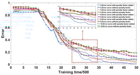 The adaptive wavelet coefficient k under different standard deviations could perform adaptive coefficient matching to different noises to achieve the greatest degree of noise reduction. Subsequent network training was prepared. Then, the denoised data were input into the ALW-DBN model for training. In the training process, the penalty factor was set to calculate the training error. Under different noise standard deviations, the influence of the penalty factor addition on the ALW-DBN model training error is shown in Figure 10.