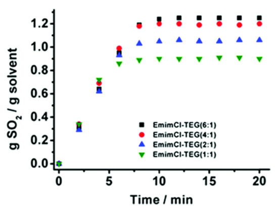 Comparison of SO2 absorption by EmimCl:TEG DESs with different molar ratios as a function of time at 293.15 K and 101 kPa (Reprinted with permission from Ref[42]. Copyright (2018) The Royal Society of Chemistry).