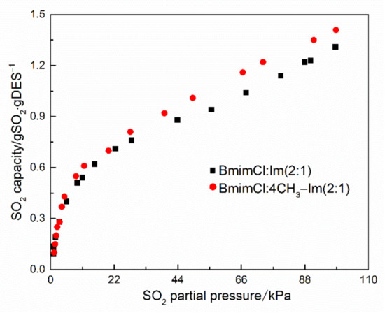Inspired by previous reports, BmimCl-based DESs and azole-based DESs could efficiently absorb SO2 through physisorption and chemisorption. A series of imidazole derivatives were selected as HBDs, including imidazole, 4-methylimidazole (4CH3-Im), pyrazole (Pyr), tetrazole, and benzimidazole (Ben-Im), paired with four different types of salts containing halogen anions to synthesize DESs by Tantai et al. [52]. SO2 absorption capacities of TBAC with different HBDs at 293.2 K and 101.3 kPa were ordered as TBAC:4CH3-Im (1:2) > TBAC:Im (1:2) > TBAC:Ben-Im (1:2) > TBAC:Pyr (1:2) > TBAC:Tetz (1:2), corresponding with the basicity of HBDs. For 4CH3-Im-based DESs, the effect of HBAs on absorption capacity was ordered as BmimCl:4CH3-Im (1:2) > P4444Cl:4CH3-Im (1:2)~ TBAC:4CH3-Im (1:2) > TBAC:Im (1:2) > TBAB:Im (1:2). The investigation concluded that SO2 capacity could be tuned by different substituents on the imidazole ring (high basicity > low basicity), the types of cations (e.g., imidazolium > TBA ≈ TBP) and anions (e.g., Cl− > Br−). BmimCl:4CH3-Im DES (1:2) exhibited a better absorption performance compared to P4444Cl:4CH3-Im DES (1:2), which indicated that imidazole ring also participated in SO2 absorption. As shown in Figure 3, the effect of SO2 partial pressure on the absorption capacity was dramatical, the SO2 absorption capacity of BmimCl:4CH3-Im DES (1:2) increased sharply from 2 to 10 kPa with the value increased from 0.244 to 0.613 g SO2/g DES and then increased linearly with the pressure from 10 to 101.3 kPa (1.42 g SO2/g DES), which implied that the chemical absorption is efficient for the SO2 capture at low partial pressures (2~10 kPa) and then the physical absorption played a dominant role as the pressure increases (10~101.3 kPa). An interesting phenomenon accompanied by the absorption process is that the colorless solvent gradually turned to brown in CPL:Im DES (1:1), which was also observed by Liu et al. [29]. Based on previous research, Tantai et al. put forward a novel strategy to prepare ternary functionalized DESs capable of chemically binding ultralow concentration (2000 ppm) SO2 in the flue gas, by mixing low-cost azole derivatives with ternary EU:BmimCl DESs [53]. By comparing the absorption capacity of ternary EU:4-CH3-Im:BmimCl DESs (1:1:1, 2:1:1, 1:2:1, and 1:1:2) with binary DESs, including EU:BmimCl DES (1:1), CH3-Im:BmimCl DES (1:1) and 4-CH3-Im:BmimCl DES (2:1), as shown in Table 2. Several conclusions can be drawn: (1) The introduction of 4-CH3-Im or Im as secondary HBDs could effectively increase the absorption capacity, which was little affected by introducing pyrazole, triazole and tetrazole. (2) EU also participated in the absorption process as an active component, as the molar absorption capacity of EU:4-CH3-Im:BmimCl DES (1:1:1) were higher than that of CH3-Im:BmimCl DES (1:1). (3) EU could remarkably regulate the interaction between SO2 and ternary DESs. 4-CH3-Im:BmimCl DES (1:1) turned into a gel during the SO2 absorption, while EU:4-CH3-Im:BmimCl DES (1:1:1) could still be liquid after absorption. The gravimetric absorption capacities of ternary EU:4-CH3-Im:BmimCl DESs (1:1:1, 1:2:1, and 1:1:2) reached 0.294, 0.347, and 0.255 g SO2/g DES, respectively, at 298 K and 2000 ppm of SO2, corresponding to 1.58, 2.29, and 2.07 mol SO2/mol DES.