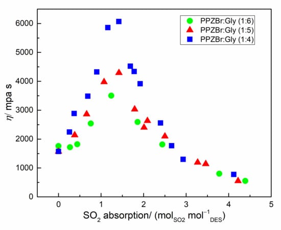 Cui et al. [54] designed a series of functionalized DESs based on piperazinium cation, which were prepared by mixing 1-hydroxyethyl-1,4-dimethyl-piperazinium bromide (PPZBr) with Gly at different molar ratios. The absorption capacities of PPZBr:Gly with different molar ratios were ranged from 0.08 to 0.1 g SO2/g DES at 293.15 K and 1 kPa, corresponding to 0.96~0.99 mol SO2/mol DES, which indicated that the molar ratio did not significantly affect the adsorption capacity under low SO2 partial pressures. The change of viscosity along with the absorption of SO2 under atmospheric conditions was investigated, as shown in Figure 4. It can be seen that the viscosity of each PPZBr:Gly DES dramatically increased in first 5 min and then decreased sharply with a further increase of SO2 dissolution. This phenomenon is similar to the finding of Wu et al. [55] and Zhang et al. [56] on SO2 absorption by ILs. The results of viscosity experiments proved that PPZBr:Gly efficiently absorbed SO2 through a combination of chemical and physical interactions.