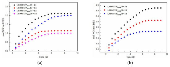 - Jiang, B.; Lin, W.R.; Zhang, L.H.; Sun, Y.L.; Yang, H.W.; Hao, L.; Tantai, X.W. 1,3-Dimethylurea tetrabutylphosphonium bromide ionic liquids for NO efficient and reversible capture. Energy Fuels 2016, 30, 735–739. [Google Scholar] [CrossRef]
