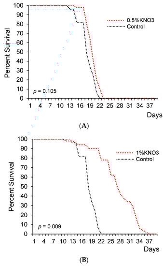 In the control group, the median lifespan was 29.5 days for female fruit flies. Different KNO3 supplementation diversely changed fruits flies’ lifespans. The measure of 0.5% KNO3 had no significant effect on the lifespan of fruit flies (Figure 1A,E). The median lifespan appeared to extend by 1.7% with 0.5% nitrate (p > 0.05), while 3% KNO3 medium concentration shortened the lifespan (p < 0.05) if compared to the control group (Figure 1A,D,E and Table 1).