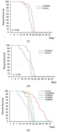 The impact of potassium nitrate on the lifespan of female flies. Female flies supplemented with 0.5% ((A); n = 50; p = 0.105), 1% KNO3 ((B); n = 50; p = 0.009), 2% KNO3 ((C); n = 50; p = 0.005), and 3% KNO3− ((D); n = 50; p = 0.421). Cumulative survival of females (E).
