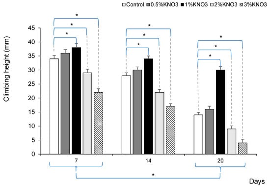 Potassium nitrate impact on fruit fly’s locomotor decline. * p < 0.05 comparison between control vs. different potassium nitrate groups, and in each group between 7, 14, and 20 days.