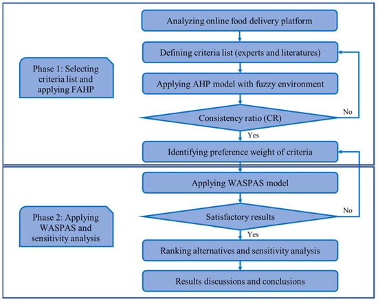 In the presented research work, a hybrid MCDM framework for the assessment of the OFD market in Vietnam is established concerning a comprehensive set of criteria: social and environmental dimensions (healthy and safety, information security, and environmental impact), economic aspects (delivery cost, operational capability, and risk management), service quality (order fulfillment, delivery speed, convenience of payment, online/offline service level, and customer feedback), and technology (web design, real-time tracking systems, and marketing techniques). In view of the discussion by exhaustively reviewing the literature, the combination of FAHP and WASPAS has been proposed for the first time in the current research to solve the problem. By using the triangular fuzzy sets in the AHP, experts’ judgments in linguistic terms can be translated to obtain more scientific and accurate attribute weights of the criteria. Moreover, the consistency test was performed to check the uniformity of the expert’s input while the sensitivity analysis was implemented to test the robustness of the approach. With the presented case study being successfully addressed, the trustworthiness of the proposed integrated framework is demonstrated. The results illustrate that the applied model reach common green OFD company rankings.