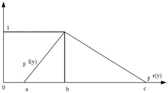 Zadeh [45] introduced the fuzzy set theory to handle uncertain conditions in multi-criteria decision-making problems. As shown in Figure 2 and Equation (1), a triangular fuzzy number (TFN) is defined as , which indicate the lower value, mean value and upper value, respectively.