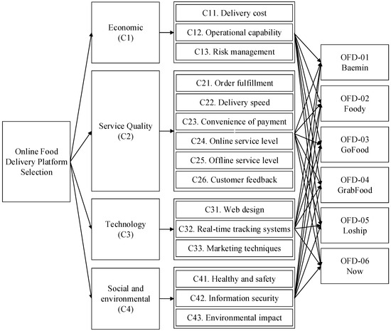 In this paper, a case study of online food delivery (OFD) platform companies in Vietnam is used to test the proposed model’s effectiveness. After preliminary assessment, a total of six experts helped to do survey questionnaires to rank the top six OFDs companies (Baemin, Foody, GoFood, GrabFood, Loship, and Now) who all have more than ten years of work experience in the online food delivery industry. To this end, FAHP is used to determine the relative preference weight of each criterion. Figure 3 presents the decision hierarchy for evaluation and selection OFDs including four main criteria and 15 criteria, which are economic (delivery cost, operational capabilities, and risk management), service quality (order fulfillment, delivery speed, convenience of payment, online service level, offline service level, and customer feedback), technological (web design, real-time tracking systems, and marketing techniques), and social and environmental (healthy and safety, information security, and environmental impact). Then, WASPAS is used to rank all alternatives, and the robustness and comprehensive of the model is proven using sensitivity analysis.