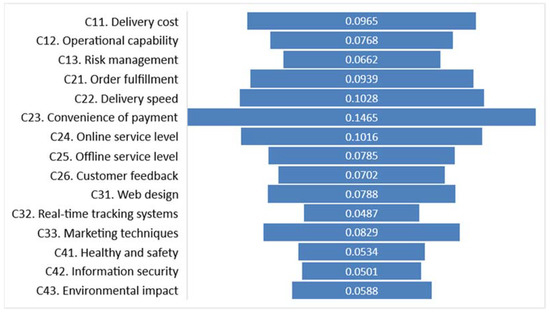 Figure 4 depicts the FAHP model’s significance level of criteria. As shown, convenience of payment (C23), delivery speed (C22), online service level (C24), delivery cost (C11), and order fulfillment (C21) are the top five significant criteria, scored at 0.1465, 0.1028, 0.1016, 0.0965, and 0.0939, respectively. The findings suggest that, in the evaluation of experts, service quality (i.e., convenience of payment, delivery speed, online service level, and order fulfillment) should be paid greater attention than the other aspects.