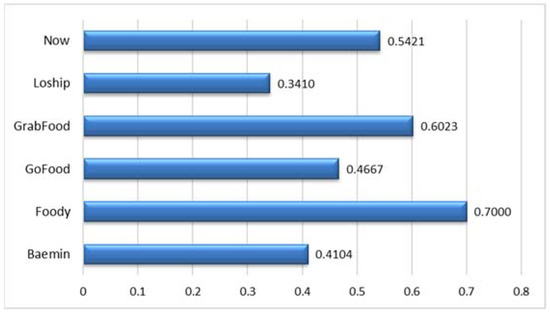 According to the process of WASPAS model, the aggregated utility function value is calculated using weighted sum mode (WSM) and weighted product model (WSM), as can be seen in Table 11. From the results, the top three online food delivery (OFD) platform companies are Foody (OFD-02), GrabFood (OFD-04), and Now (OFD-06) ranked the first, second, and third with scores of 0.7000, 0.6023, and 0.5421, respectively. The final ranking order of all alternatives from WASPAS model is visualized in Figure 5.