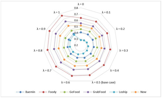 The final appraisal scores and the final ranking of alternatives based on sensitivity analysis of WASPAS model are shown in Table 12 and Figure 6, respectively. From the results, it shows that the best alternative is always the same when changing the values of coefficient value (λ) from 0 to 1. It can be concluded that Foody (OFD-02) is consistently the optimal alternative to take over. Besides, GrabFood (OFD-04) and Now (OFD-06) are also ranked the second and third positions, which is also better alternatives among candidates. As a result, it can be said that the applicability of the suggested model to real-world problems has been established. The sensitivity analysis is performed to investigate the reliability of the proposed picture fuzzy decision-making approach. The study successfully proposed a hybrid MCDM model by combining FAHP and WASPAS to support the evaluation and selection of sustainable online food delivery (OFD) platform companies.