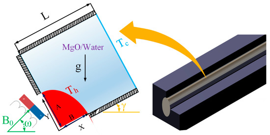 A two and three-dimensional square enclosure, with dimensions L, contains MgO/water NFs. The enclosure has an angle of ω with the horizon. There is a blade with a temperature of at the bottom left edge of the enclosure. This blade is a part of the vertical ellipse. The right edge is at , while the left, upper, and lower edges are insulated. An MGF with an intensity of is applied to the enclosure. The MGF has an angle of with respect to the horizon. NCHT occurs inside the enclosure due to the temperature difference of the edges. The Boussinesq approximation is used to create the buoyancy force. Figure 1 illustrates the geometry of the desired enclosure.