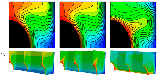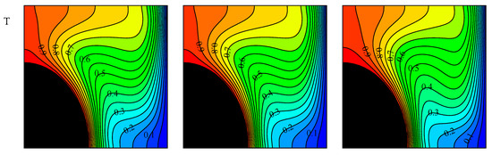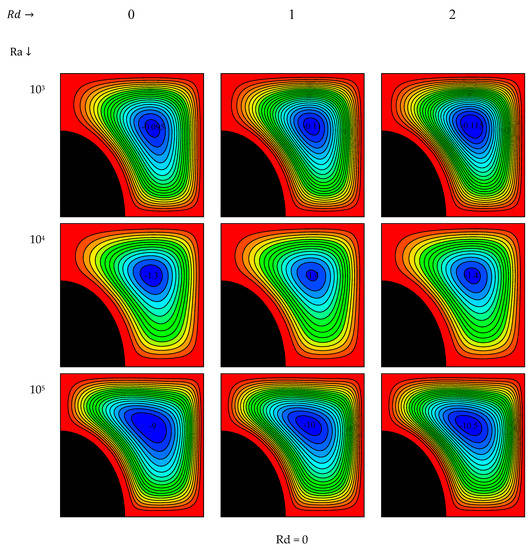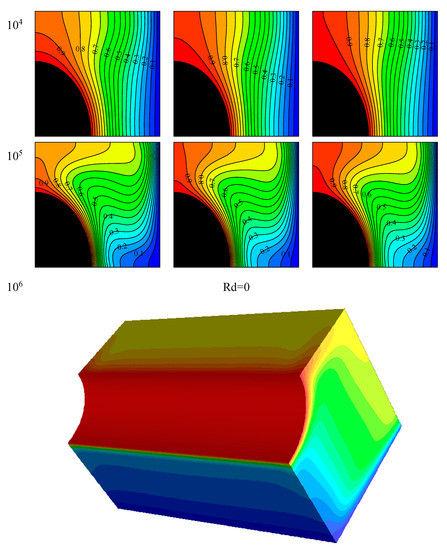 Figure 5 depicts the temperature contours for the above-mentioned values. Concerning the isotherm lines, it was observed that changing both parameters of Ra and RAP affected the isotherm parameter and changed the lines. Compared to the RAP, changing the Ra significantly affects the temperature field due to its greater disruption of the fluid. Though this process was found to disrupt the isothermal lines, it also had a great effect on them. The variation of RAP, which has a heat transfer mechanism and therefore did not impose great effects on the isothermal lines affected by the flow field, increased the radiation heat transfer. In this way, increasing the Ra increased the strength of the flow field, highly disrupted the fluid inside the enclosure, and led to irregular isothermal lines that were regular and flat with the low Ra values.