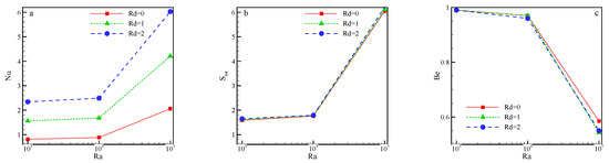 In Equation (4), Rd is defined as , and the value is expressed as in Equation (5). In addition, the definition of the dimensionless numbers of Rayleigh (Ra), Prandtl (Pr), Hartmann (Ha), Local Nusselt (NuY), and Bejan (Be) are as follows: