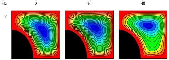Figure 7 illustrates the velocity and temperature contours for the above-mentioned values. As shown, increasing the Ha reduced the strength of fluid displacement in the enclosure. Furthermore, decreasing the NCHT in the enclosure decreased the velocity of the vortices. It should be noted that the reduction in the flow contours was observed in the form of a decreased value of flow function. In general, it can be said that the stronger the MGF, the higher the resulting force, which is called Lorentz force and is applied to the MGF. In isothermal field lines, an augmentation of the Ha decreased the congestion in the upper and lower regions of the enclosure. Accordingly, increasing the force from the MGF decreased the fluid velocity and thus reduced the temperature difference in the enclosure, which was seen as a reduction in the congestion of isotherm lines.