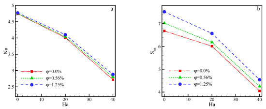 Figure 8 provides the mean Nu and EGE for constant and variable values. Considering the diagram of the Nu and EGE, it can be seen that an augmentation of the Ha decreased these two values. On the other hand, an augmentation of the strength of MGF was interpreted increasing Lorentz force in the enclosure, resulting in a reduction of the velocity of the fluid in the enclosure in the first phase and a decrease of the temperature difference along the constant-temperature edges in the second phase due to the decrease in fluid velocity. Given the dependence of entropy on temperature difference and velocity, an augmentation of the Ha reduced the amount of EGE. Though entropy depends on the MGF, the dependent parameter is much smaller than that of the two entropies that dependent on the temperature difference and velocity. Both graphs indicate the changes in terms of the volume percentage of NPs. In this case, both graphs show an ascending trend with increasing NPs in water. The addition of NPs increased the thermal conductivity of the fluid and ultimately increased HTR and EGE.