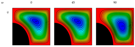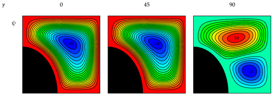 Figure 12 provides the velocity and temperature contours for the above-mentioned values. Changing the angle of the enclosure essentially changed the angle of the gravitational acceleration in the momentum equation. Since the NCHT depends on the angle of the gravitational acceleration, any change in the angle of the enclosure affected this acceleration. The direction of the buoyancy force was in line with the gravitational force and opposite to its direction. Hence, changing the angle of the enclosure significantly affected the angle of the buoyancy force, such that an augmentation of the enclosure angle increased the number of vortices from one to two in the field of flow lines. As shown in temperature field, increasing the angle of the enclosure increased the curvature of the isotherm lines in the middle of the enclosure due to the increased number of vortices from one to two; this resulted in a greater degree of fluid disruption in the middle of the enclosure and at the collision area of the two vortices.