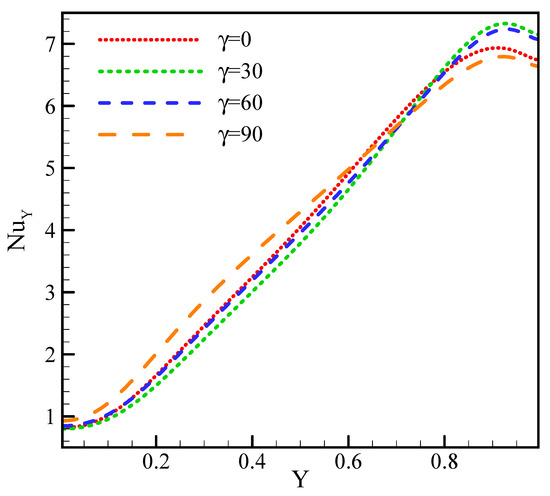 Figure 10 shows the local Nu on the cold edges for the above-mentioned values. According to the local Nu, increasing the angle of the MGF increased the HTR in the lower part of the edge and decreased its value near the edge due to the collision of hot fluid in the cold edge. In the horizontal MGF mode, the highest impact of hot fluid collision occurred in the upper part of the edge, which created heat transfer in this place that was greater than that of any other case. It can be stated that increasing the angle of the MGF to 90 degrees increased the amount of HTR in the middle of the edge and reduced the amount of HTR above the enclosure.