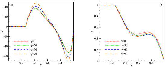 Dimensionless velocity (a) and dimensionless temperature (b) at Y = 0.5 for and different cavity angles.