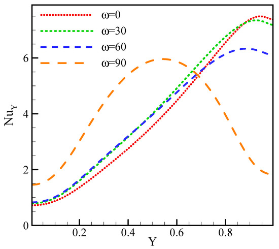 Figure 13 illustrates the values of the local Nu on the cold edge of the enclosure for the above-mentioned values. The enclosure’s angle variation, especially at high angles, significantly affected the heat transfer from the cold edge, such that verticalizing the enclosure replaced the area with the most heat transfer. The vertical enclosure of the fluid collided with the cold edge in the middle of the fluid hot edge, but this issue mostly occurred at the upper part of the edge. Therefore, in the vertical enclosure, the highest HTR was observed in the middle of the edge, although the highest Nu could be found at the bottom of the edge.