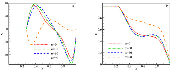 Figure 11 shows vertical velocity and dimensionless temperature diagrams plotted in the middle horizontal line of the enclosure. In the vertical velocity diagram, an augmentation of the MGF angle increased the velocity of the enclosure to its maximum level. In this case, a stronger vortex was created in the enclosure due to its better conditions. The temperature diagram shows that changing the angle of the MGF led to a slight change in the dimensional temperature in the middle of the enclosure. Since no specific change was observed in the temperature at the side of the edges, the temperature was 1 at the beginning of the edge. There was a blade in this region of which the dimensionless temperature was 1, a value that decreased as the blade approached the temperature of the cold edge.