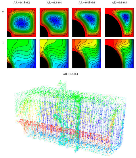 Finally, increasing the elliptically shaped blade’s aspect ratio increased the Nu and entropy in the enclosure. However, a further increase in the aspect ratio was able to significantly decrease both of these values. In this case, increasing the aspect ratio always increased the Be.