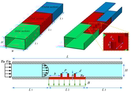 Figure 1 displays the represented sketch of the microchannel and the limiting constraints at the boundary. The geometry consisted of three sections, namely, an inlet, a corrugated bottom wall test section, and an exit section. The height and width of all three sections were = 40 μm and = 70 μm, respectively. The inlet and outlet sections were, respectively, used to affirm a fully developed flow within the corrugated test section and evade the detrimental pressure effects on the hydrothermal performance of nanofluid flow. The length of each section was 4 mm. Table 1 reports different cases of geometrical parameters considered in the present study.