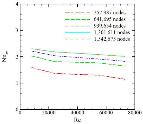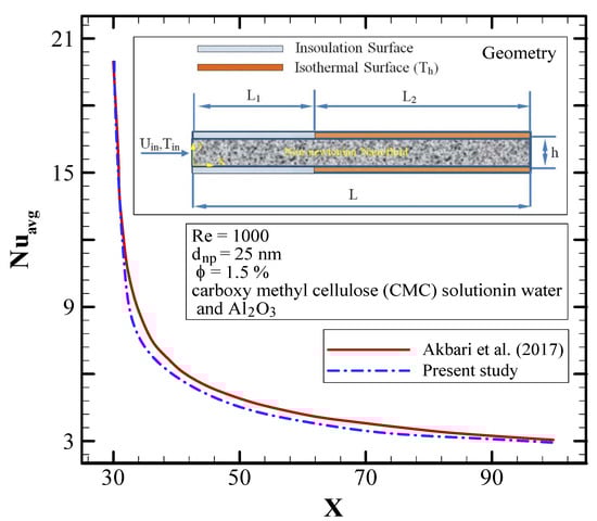 The grid independency test was performed using five different grid resolutions of 252,987, 641,695, 939,654, 1,301,611, and 1,542,675 for the 3D microchannel with corrugations. Nuav values calculated on the lower wall were compared for different grids, and it was found that the grid resolution of 1,301,611 could be selected to achieve accurate results with reasonable computational time (Figure 2). CFD software code presented for this study was validated by quantifying the Nuav of water flow along a microchannel and analyzing the same with existing results of Akbari et al. [35]. They investigated the influence of particle dimension and velocity over the thermo-convective behaviour in elasticoviscous nanofluid flow. Their experimentation dealt with analyzing the thermo-convective behavior and hydrodynamic attributes pertaining to the flow characteristics of non-Newtonian nanodispersion. They numerically simulated laminar forced convection of elasticoviscous nanodispersion flow comprising of water-carboxy methyl cellulose and alumina at varied particle concentrations (0.5 and 1.5). According to Figure 3, the results of our study are on par with those of Akbari et al. [35].