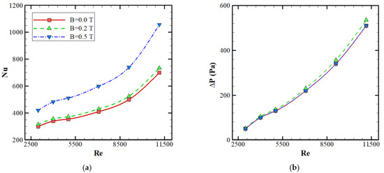 The impact of magnetic flux density (magnetic field effect) over the Nuav, pressure drop, friction factor, and PEC for h = 10 μm, p = 1.0 μm, d = 8 μm and different Re is elucidated in Figure 8. As shown in Figure 8a, the Nuav increased with . Under every studied scenario, higher estimates of Nuav were achieved in the microchannel prone to the effect of the magnetic flux density than in the conventional microchannel (B = 0.0). This is due to the fact that the magnetic field pushed the nanoparticles proximate to the base wall, influencing higher disturbances and decreasing the boundary layer thickness on the base wall, resulting in higher temperature gradients. It can be observed that B = 0.5 T had the maximum heat transfer compared with the other values. This pertains to the fact that the stronger the magnetic field, the turbulence intensity increases, leading to a higher mixing rate of the elasticoviscous nanofluid at higher values. In addition, it can be seen that the magnetic field with B = 0.1 T did not have a substantial impact on the thermal behaviour across the flow conduit.