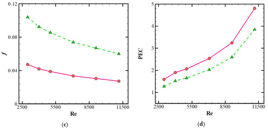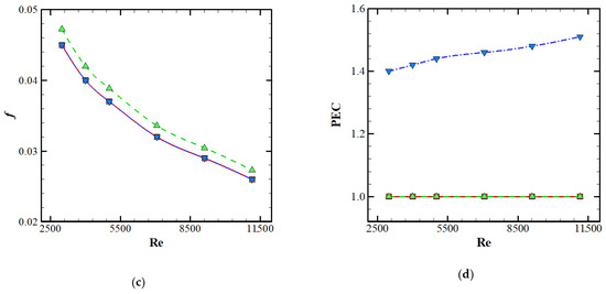 Figure 11c demonstrates the friction factor coefficient along the microchannel for different values of . The value of friction factor coefficient for d = 12 μm was the maximal as opposed to other geometries. In contrast, the minimum measure pertained to d = 8 μm. Moreover, it is noteworthy that the friction factor coefficient declined slightly with the flow velocity for all geometries. Figure 11d shows the PECs evaluated using Nuav and friction factor coefficient. The outcomes depict that the quantum of thermal and hydraulic PEC index had fairly analogous tendencies in the measured zone of flow velocity for all cases. The ideal flow velocity was related to Re = 11,000 for all examined cases. The thermal and hydraulic PEC index of microchannel with d = 12 μm had the maximum value for all flow velocities. The value of the thermal and hydraulic PEC index for microchannel with the diameter of d = 8 μm at Re = 11,000 was 1.588, whereas it was 1.582 pertaining to d = 12 μm at the same Re.