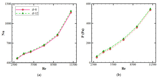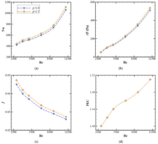 Figure 11 exhibits the impact of various corrugations on Nuav, pressure reduction penalty, friction factor coefficient, and thermal and hydraulic PEC index for the microchannel with p = 1.5 μm and d = 8 μm in the vicinity of B = 0.5 T magnetic field and different Re. The evaluated Nuav distribution versus different flow velocities is shown in Figure 11a for different corrugation diameters. It can be observed that as the increased, the Nuav increased. Higher corresponded to higher fluid velocity, leading to larger disturbances in the flow and hence an improvement in the heat transfer rate. It was also realized that the channel with the diameter of d = 12 μm had the maximum value of Nuav for all studied flow velocities. The pressure drop is presented in Figure 11b for different pitches of microchannel and different Re. It was observed that d = 12 μm had the maximum value of pressure drop among all considered pitches. Therefore, the pressure drop increased with the Re.
