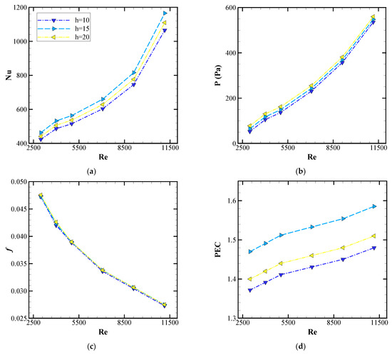 The impact of varied corrugation heights on: (a) Nuav, (b) pressure loss penalty, (c) friction factor coefficient, and (d) thermal and hydraulic PEC index, for the microchannel with p = 1.5 μm and d = 8 μm subjected to magnetic field with B = 0.5 T and different Re.