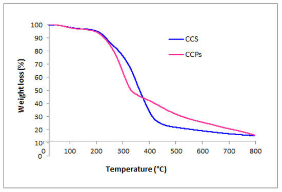 The thermal stability of CCSs and CCPs was determined by TGA. The plot of the percent weight loss versus temperature over time is portrayed in Figure 1. Thermogravimetric (TG) experiments were performed at a temperature range starting from 25 °C to 800 °C with 10 °C/min as heating rate. The TG pyrolysis plots exhibit the typical reverse s-shaped curves distinctive of the thermal degradation of lignocellulosic biomass under an inert atmosphere [34]. Moreover, the TG curves indicate that the thermal degradation of CCSs and CCPs occurred in two stages. During the first stage, the % weight loss was 2.80% and 3.12%, which occurred at 88.28 °C and 91.91 °C for CCSs and CCPs, respectively, which may be ascribed to the release of moisture. In the second stage, for both biosorbents, a continuous mass loss was observed with the rising of temperature, up to 610 °C and 670 °C for CCSs and CCPs, respectively. The highest mass % loss during the second stage was estimated to be 76.74% and 73.05%, which occurred at 351.28 °C and 303.18 °C for CCSs and CCPs, respectively. These findings may be associated with the removal of light molecules, including cellulose, hemicellulose and lignin, representing the essential constituents of the biomass among which hemicellulose is the most thermally unstable component [25]. It was revealed that the degradation temperatures of these components were in the range of 200–350 °C for hemicellulose, 250–400 °C for cellulose and 150–1000 °C for lignin [35]. At the end of this stage, it was observed that CCSs and CCPs were completely pyrolyzed, followed by a gradual drop in weight loss. The mass of biosorbents remained constant at 15.67% for CCSs and 17.14% for CCPs with the increasing of temperature, which is linked to the ash content of the biosorbents.