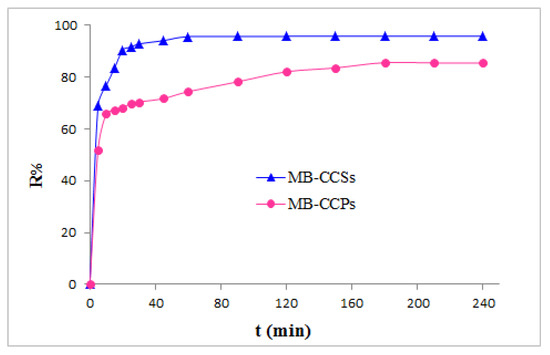 The effect of contact time on the MB removal by CCSs and CCPs as biosorbents over the time range of 0–240 min was studied; the changes in the MB removal efficiency are given in Figure 4. The removal rates of MB rose rapidly with both adsorbents during the first 20 min for CCSs and the first 45 min for CCPs, which was followed by a very slow adsorption rate. The equilibrium was reached after 60 min (R% = 95.57) for CCSs and 180 min for CCPs (R% = 85.55). This trend could be explained by the fact that a huge number of abundant unoccupied binding sites on the surface of both adsorbents were accessible at the adsorption process onset. In the middle stage, these sites were progressively covered, resulting in the adsorbent surface saturation. In the final stage, when all sites were fully occupied, the removal efficiency values remained constant, as no further adsorption occurs after the mentioned equilibrium times [26]. Hence, 60 min and 180 min were selected as the MB-CCS and MB-CCP optimum times, respectively, for subsequent batch experiments.
