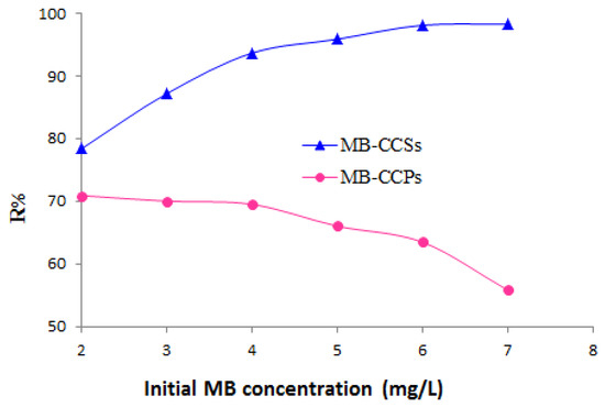 Effect of initial MB dye concentration on the removal efficiency of MB dye using CCSs and CCPs.