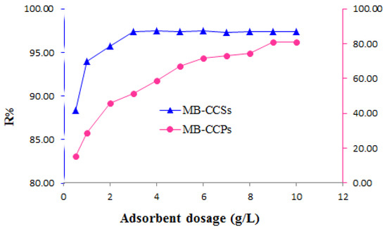 Effect of adsorbent dosage on MB removal efficiency using CCSs and CCPs.