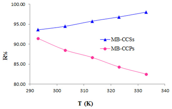 The impact of temperature on the MB dye uptake percentage by CCSs and CCPs was investigated between 293 and 333 K. As shown in Figure 8, the MB percent uptake by CCSs was increased from 93.58 to 98.00% upon increasing the temperature, which is indicative of the nature of the endothermic process. This could be linked to the rise in the kinetic energy of MB dye ions, resulting in increasing the chemical interaction with the adsorbent surface as well as an enhancement in the diffusion rate of the adsorbate molecules on the adsorbent particles [13,14].