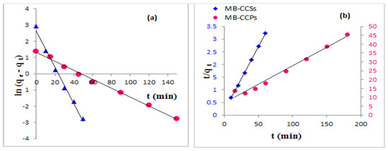 The investigation of adsorption kinetics is of remarkable importance for the determination of the equilibrium time and the rate of adsorption [62]. In this work, biosorption kinetics of MB dye was assessed, using pseudo-first and pseudo-second order models. The parameters of each model were calculated from the intercept and the slope of the appropriate linear curves shown in Figure 10a,b. These values are summarized in Table 6 in addition to the correlation coefficients in order to check the fitness of the kinetic models with the experimental data.