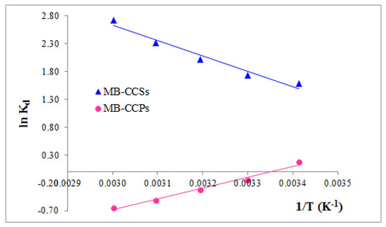 The plot of ln Kd as a function of 1/T for the removal of MB dye by CCSs and CCPs.