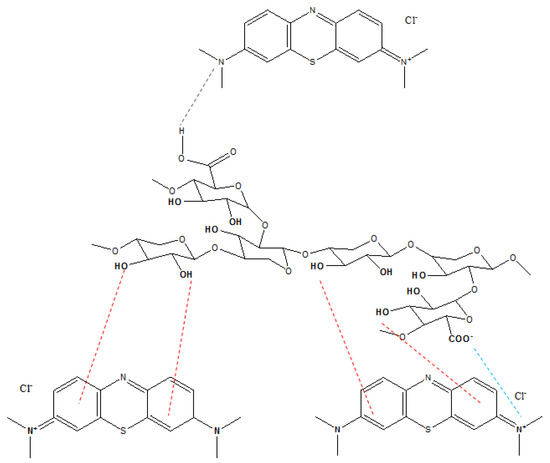 The effect of pH on MB loading is another indicator on the importance of electrostatic interaction between the dye and biosorbents. Indeed, it was found that the electrostatic interaction between the cationic MB dye dissociated into MB+ and Cl− groups and adsorbents increased at pH > pHPZC since the biosorbents’ surface became more negatively charged. At the surface, the carboxylic groups were deprotonated and the carboxylate anions (-COO−) were electrostatically attracted to the positively charged quaternary ammonium group of MB cationic dye [40]. Furthermore, dipole–dipole hydrogen bonds might be formed between hydroxyl groups acting as proton donors on the surface of the biosorbents and nitrogen atom acting as proton acceptors in the MB dye [64]. The n–π interactions could be formed between oxygen atoms in the carbonyl groups (electron donors) of the biosorbent surface and aromatic rings (electron acceptors) in the MB dye [19]. This mechanism is supported by the FT-IR results, which revealed that the intensity of the IR bands of the above-named functional groups decreased after MB adsorption. Accordingly, organic functional groups of CCSs and CCPs played a significant role in the MB biosorption. Hence, the adsorption of MB onto CCSs and CCPs could occur via three possible mechanisms, viz. hydrogen bonding, n–π interactions and electrostatic attraction, which prove that physisorption and/or chemisorption could be involved in the biosorption process. All these interactions are shown in Figure 12.