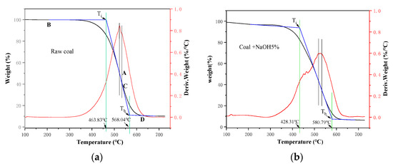 Figure 2 illustrates the TG and DTG curves of Raw coal sample and treated coal samples by NaOH solution and microwave combined NaOH solution. The of coal samples can be obtained by using the intersection method through the TG-DTG curves [21]. For the simplicity of description, two points on a TGA curve are first identified. Point A in Figure 2a is the point at which a vertical line from the first DTG peak crosses the TGA curve. Point B is the point at which devolatilization begins. A tangent at A on the TGA curve and the horizontal line through B are drawn. The corresponding temperature at the intersection of the two lines is identified as the ignition temperature ().