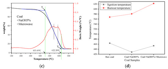Thermos-gravimetric and differential (TG-DTG) curves of coal sample: (a) raw coal; (b) Coal treated with a 5% sodium hydroxide solution; (c) Coal treated with a 5% sodium hydroxide solution combined with microwave irradiation; (d) Ignition and burnout temperatures of samples.