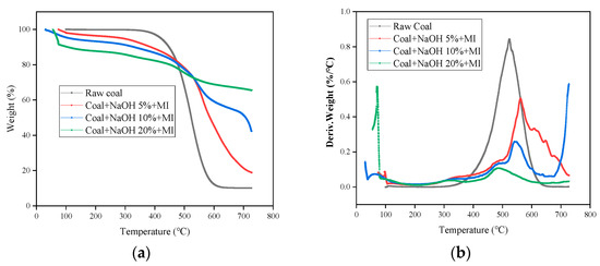 The TG and DTG curves of coal samples treated with different sodium hydroxide solution concentrations are plotted in Figure 3. Coal samples which treated with a 5% concentration of sodium hydroxide solution and microwave irradiation were denoted as “Coal+NaOH 5% + MI”.