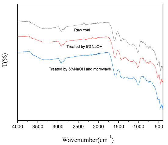 The FTIR analysis was carried out to describe the functional groups of coal samples. Figure 4 shows the infrared spectrum of raw coal, coal sample only treated by 5% sodium hydroxide solution and coal samples treated by microwave irradiated combined with 5% sodium hydroxide solution.